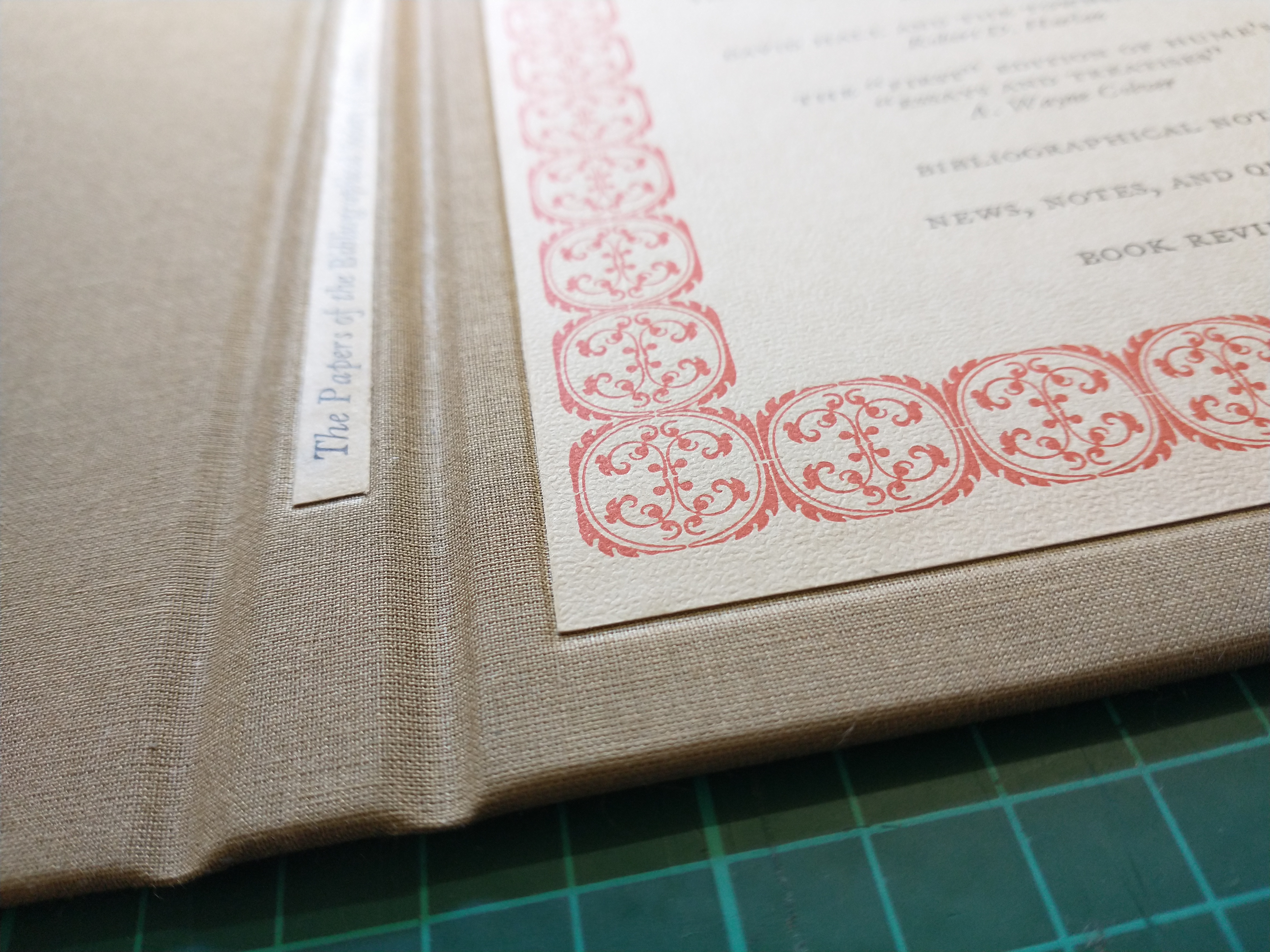 I did indulge my bookbinding skills in one instance though. Gary Nored's ‘The Lord of the Rings—A Textual Inquiry’, in The Papers of the Bibliographical Society of America (vol. 68, no. 1, 1974, pp. 71–74), is a good example of a ‘side-stitch’ (or side-stapled) binding; although—curiously and usefully—still printed and folded in sections.